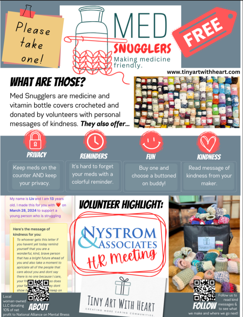 Do you serve youth facing hardships? We would love to drop off free, volunteer-made, art donations with messages of kindness for them! You can see all our tiny art project donations here and learn more about our flagship Med(ication) Snugglers here. We have joy to go around! See the flyers below as well.